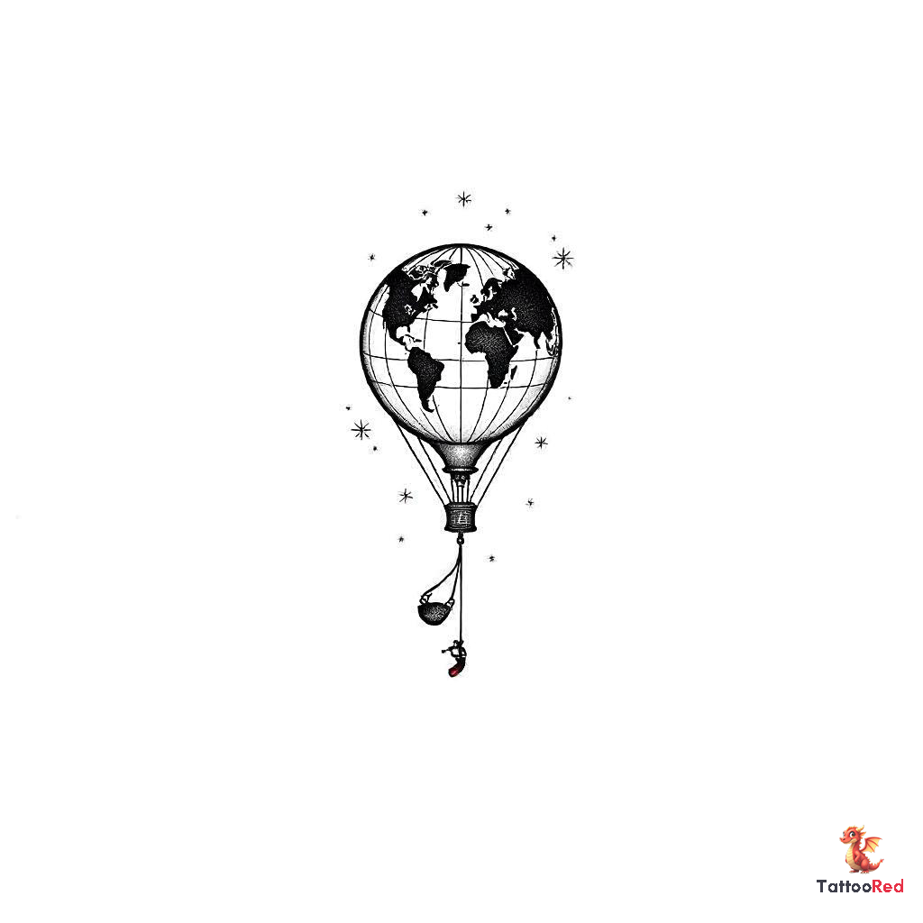 a hot air balloon with a swing on the bottom and the ballon shows the outer lines of a world map