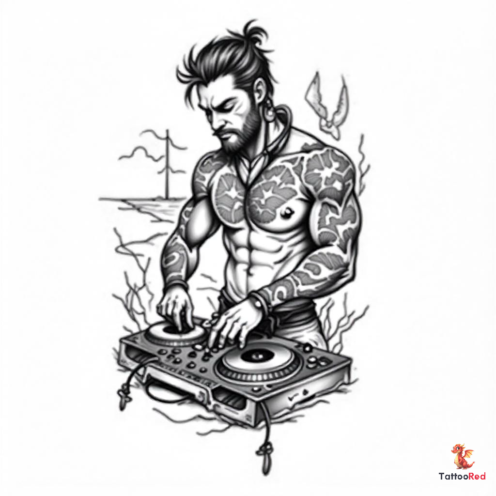 The tattoo design featuring a DJ mixing at the beach is a vibrant representation of modern culture and lifestyle, embodying the spirit of music, freedom, and celebration. This neo-traditional tattoo showcases a muscular DJ, deeply immersed in his craft, standing behind a turntable. The intricate details of the design breathe life into the scene, capturing not just the essence of music but also the atmosphere of a beach party. The artist employs bold lines and shading techniques typical of neo-traditional tattoos, ensuring the figure stands out while seamlessly blending with the background elements.