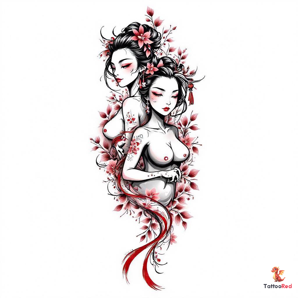 The beauty of geisha tattoos lies not only in their artistic representation but also in their rich cultural significance. This tattoo design features two geishas in a sensual pose, beautifully showcasing their bodies amidst a backdrop of delicate cherry blossoms. The realistic style of this tattoo captures intricate details, from the graceful curves of the geishas' figures to the subtle expressions on their faces, which embody both elegance and allure.