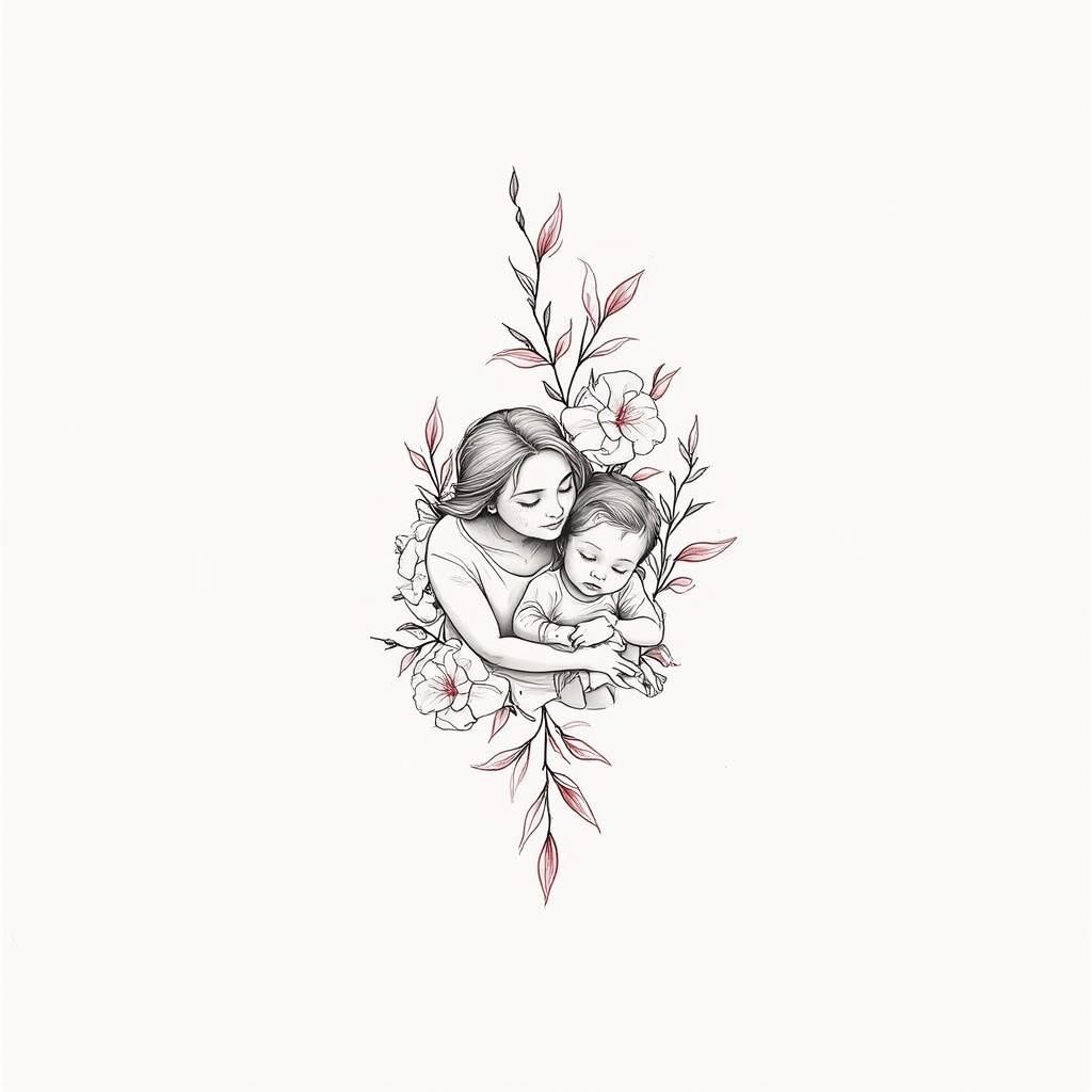 A realistic portrait-style tattoo can serve as a beautiful tribute to family, capturing the essence of those we love in intricate detail. This particular black-and-grey tattoo design portrays a tender moment between a mother and her child, emphasizing their emotional bond. The artist skillfully captures the expressions of both figures, conveying warmth and affection through intricate shading and lifelike features. The mother's gaze is one of deep love and connection, while the child’s serene expression evokes a sense of peace and safety in her arms. Surrounding them are delicate floral elements, which add a touch of softness and beauty to the overall composition. These flowers can symbolize growth, love, and nurturing, enhancing the emotional depth of the piece.