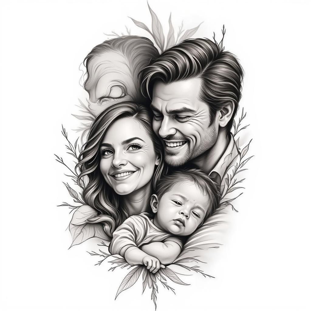 A realistic portrait tattoo of a family is a deeply emotional expression of love and connection that captures the essence of cherished moments. This specific design, executed in black-and-grey style, highlights the intricate details and expressions of family members, making it a powerful representation of familial bonds.