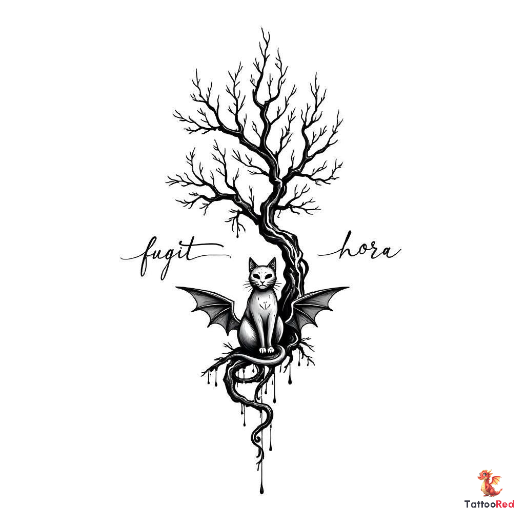 The dripping liquid from the cat's nose and eyes adds a gothic flair, evoking a sense of intrigue and depth. This detail invites viewers to reflect on the emotional weight the tattoo may carry. The script below the cat, reading 'fugit hora,' which translates to 'time flies,' further emphasizes the transient nature of life, making this tattoo not just a visual statement but a profound reminder of time's passage and the importance of family.