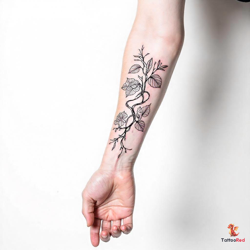 The grapevine branch tattoo design wrapping organically around the forearm is a stunning representation of nature's elegance and beauty. This neo-traditional tattoo merges modern artistic techniques with classic elements, creating a unique visual experience. The design features intricate grape leaves and twisting vines that elegantly wrap around the forearm, symbolizing growth, abundance, and connection to nature. Each leaf is meticulously detailed, capturing the essence of natural beauty. The flowing lines of the vine create a sense of movement, making it look as if the tattoo is alive and dynamically interacting with the skin. This design not only serves as a beautiful ornament but also carries deeper meanings related to life's cycles and the richness of experiences. Grapevines are often associated with prosperity and fertility, making this tattoo a meaningful choice for those seeking to symbolize these themes in their lives. The choice of a forearm placement makes it easily visible, allowing the wearer to showcase their connection to nature. This tattoo appeals to both men and women, as the design is versatile and can be adapted to individual tastes. The neo-traditional style elevates the tattoo with bold outlines and vibrant colors, enhancing its impact. The use of color can range from rich greens and deep purples to more muted tones, depending on the wearer's preference. This adaptability makes the grapevine branch tattoo not only a beautiful piece of body art but also a personal expression of one's identity and values. In essence, this tattoo design resonates with those who appreciate nature, beauty, and the deeper meanings behind the symbols they choose to wear. It's a perfect choice for anyone looking to adorn their skin with a piece of art that tells a story and speaks to their personal journey. Whether you're someone who values the symbolism of growth and abundance or simply someone drawn to the aesthetic appeal of an organic design, this grapevine branch tattoo holds the potential to become a cherished part of your body art collection. As you contemplate your next tattoo, consider how this design could reflect your own life experiences and aspirations, making it a truly unique addition to your collection. Embrace the beauty of nature with this exquisite tattoo that celebrates life and creativity, leaving a lasting impression on all who see it.