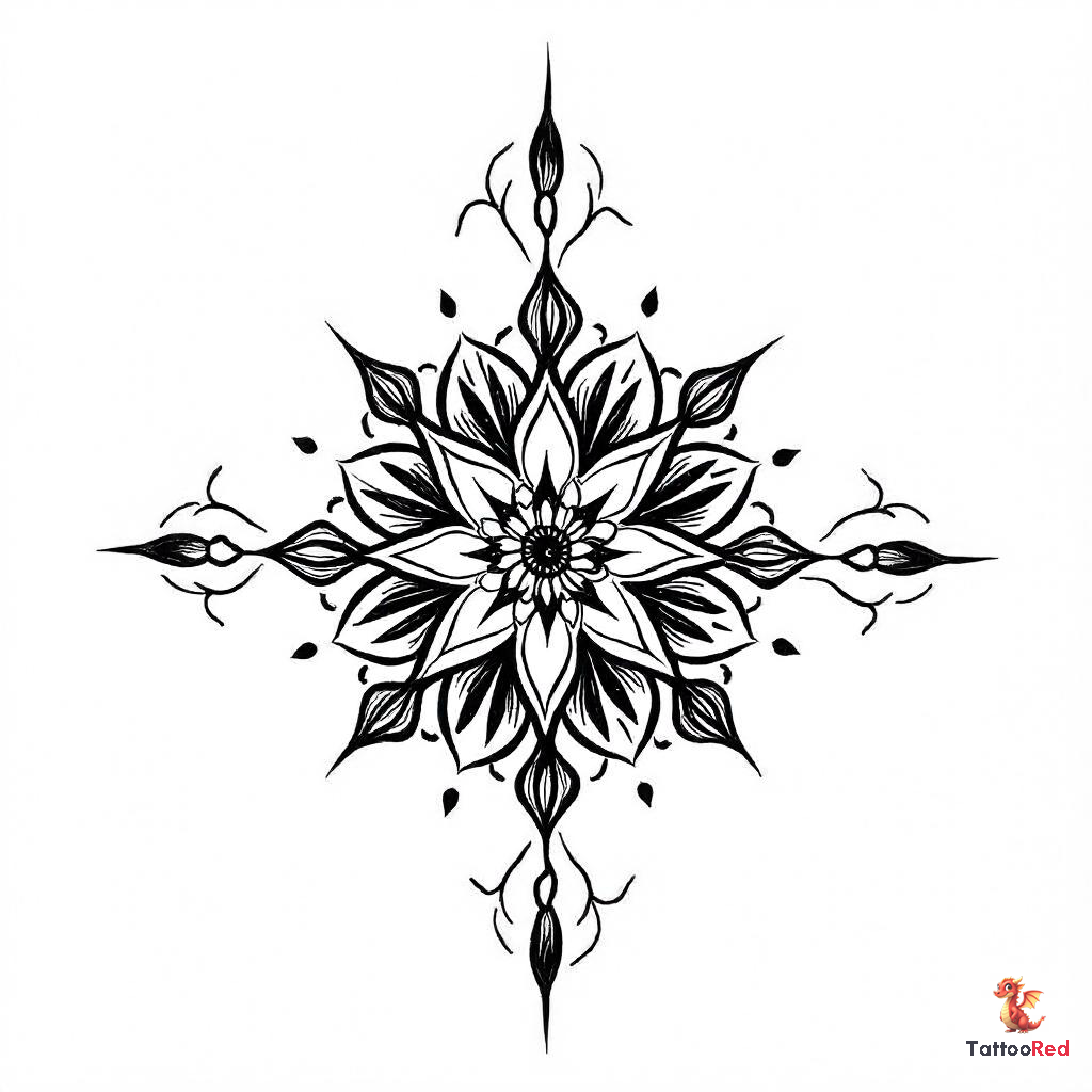 A bold and intricate mandala tattoo design captures the eye with its symmetrical beauty and detailed craftsmanship. The mandala, often representing the universe in a visual form, encompasses a rich tapestry of patterns and shapes. This specific design features strong lines that create a sense of depth and movement, drawing the viewer into its mesmerizing intricacy. Each petal and leaf is meticulously detailed, showcasing the skill involved in its creation. The vintage style adds a nostalgic feel, reminiscent of traditional tattoo art yet infused with a modern twist. This tattoo can be seen as a reflection of one’s journey toward self-discovery and inner peace, a personal emblem of spirituality and enlightenment.