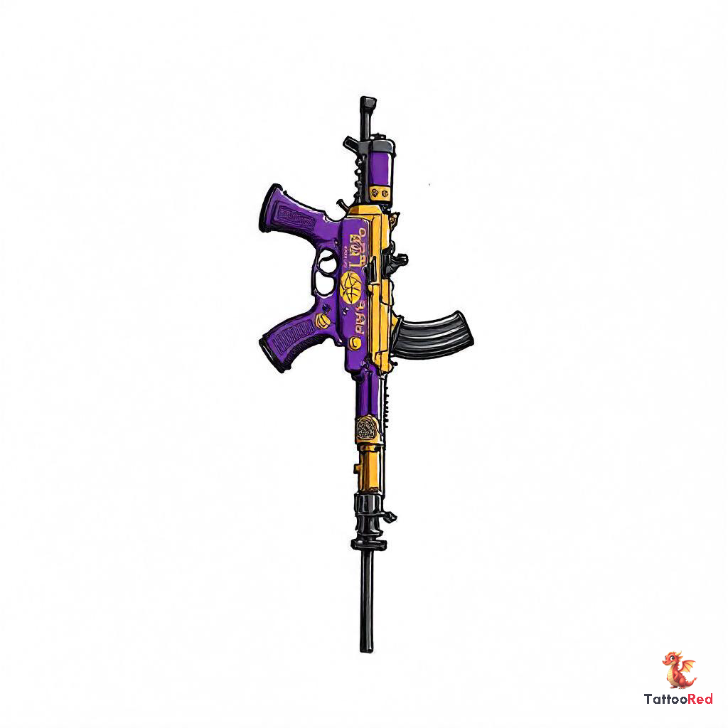 In terms of themes, this tattoo embodies power, strength, and loyalty. The vibrant colors of purple and gold evoke feelings of royalty and energy, while the gun elements inject a sense of daring into the design. This combination is ideal for individuals who want their tattoos to reflect not only their interests but also their personality and values.