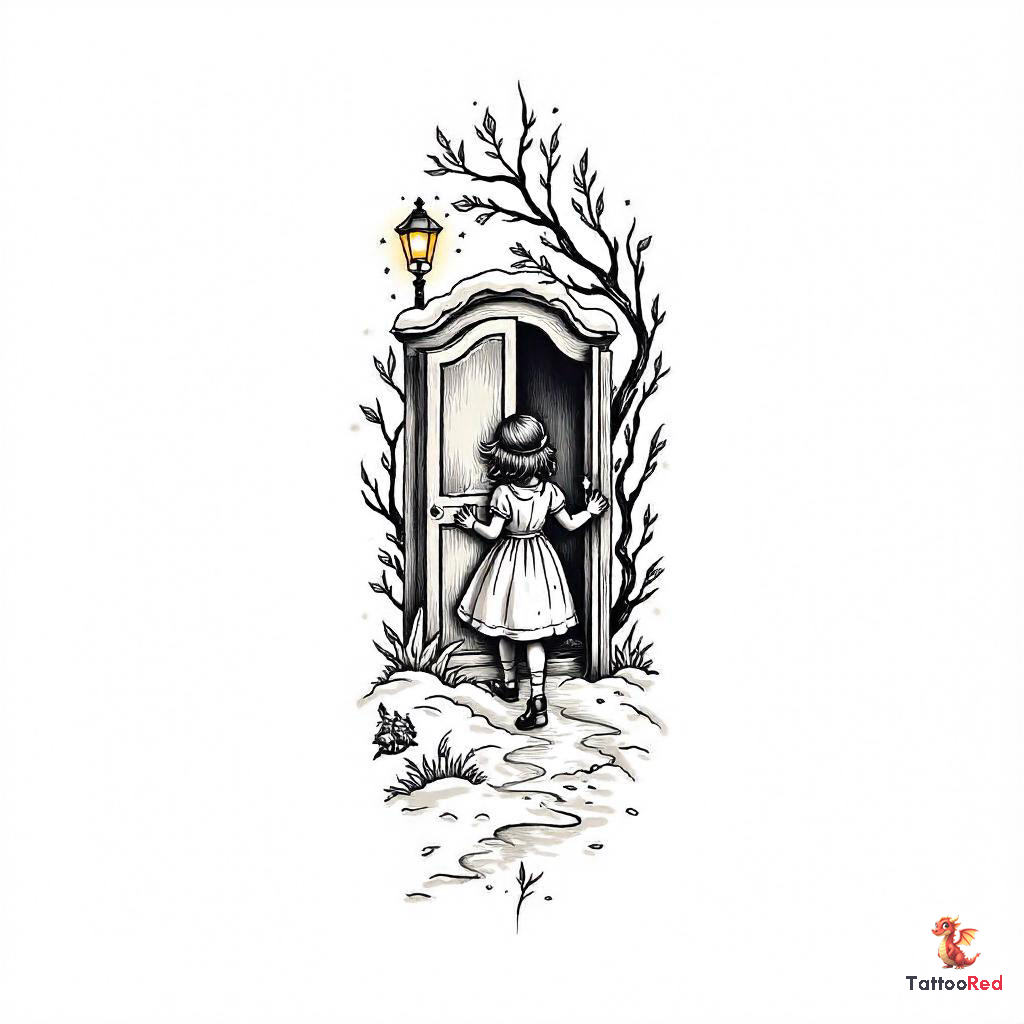 Tattoo designs like this one draw not just on the visual elements but also on the deeper cultural and literary meanings. Lucy Pevensie is not just a character; she embodies courage, innocence, and a sense of wonder that resonates with many. Choosing a tattoo of her stepping into the wardrobe can reflect personal qualities such as bravery and the pursuit of dreams. In literature, wardrobes and doors often represent transitions, making this piece particularly symbolic for anyone going through a significant change in their life.
