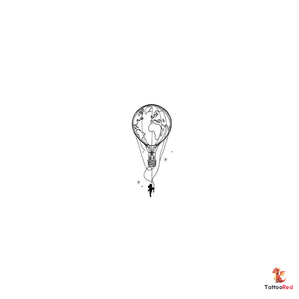Minimal micro tattoo of a hot air balloon world map, ultra simplified oval balloon, smooth continent