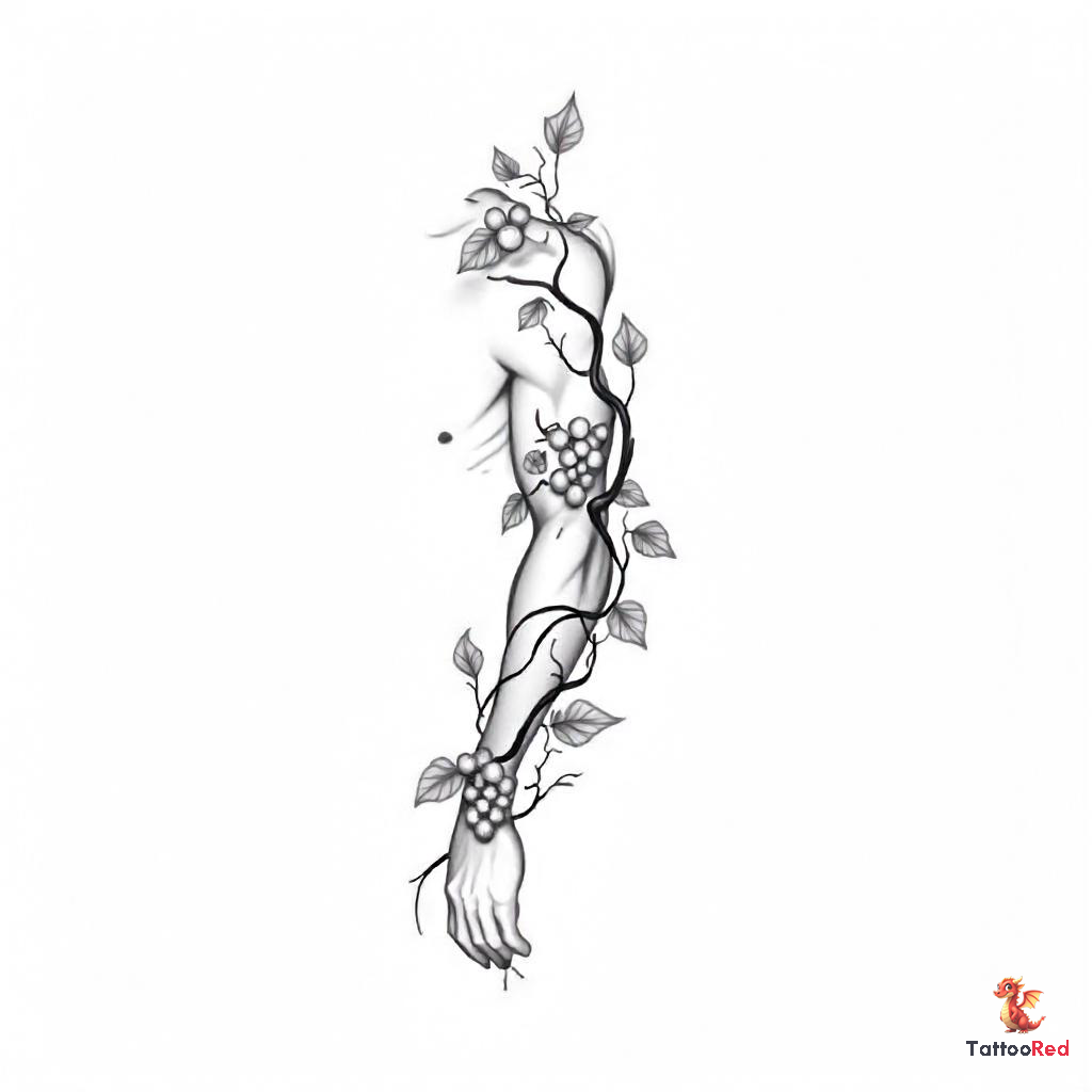 Clusters of grapes, depicted with remarkable detail, add depth to the design. The grapes are not merely depicted as simple shapes but are crafted to look plump and juicy, complete with highlights and shadows that emphasize their roundness and texture. This attention to detail not only enhances the tattoo's visual appeal but also symbolizes abundance and fertility, making it a meaningful choice for many.