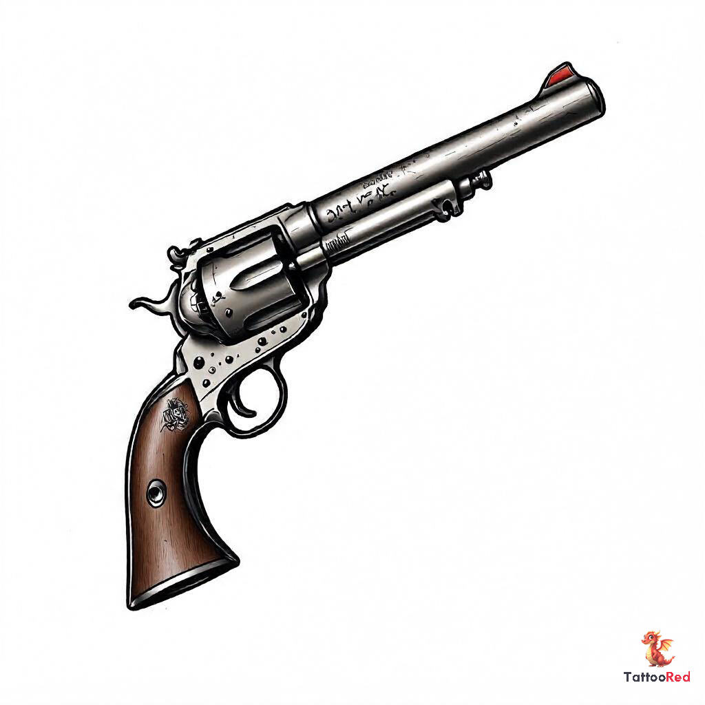 The tattoo design featuring a large caliber gun is a striking representation of strength and power, perfect for those who appreciate the intricate details of weaponry. This realistic tattoo showcases a beautifully crafted revolver with metallic textures that are expertly rendered to give a lifelike appearance. The combination of shiny metallic surfaces and deep shadows creates a sense of depth, making the gun appear almost three-dimensional. The wooden grip adds a touch of warmth and contrast to the cold metal, highlighting the craftsmanship of the design.