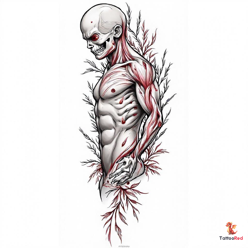 The addition of red accents, mimicking blood or perhaps a sense of vitality, enhances the visual impact of the tattoo. These vivid splashes of color contrast beautifully with the monochromatic tones of the figure, creating a dramatic effect. The branches that seem to grow from the figure represent a connection to nature, symbolizing growth and renewal amidst the inevitability of decay. This duality can resonate on multiple levels, making it a meaningful choice for individuals who appreciate the complexity of life.