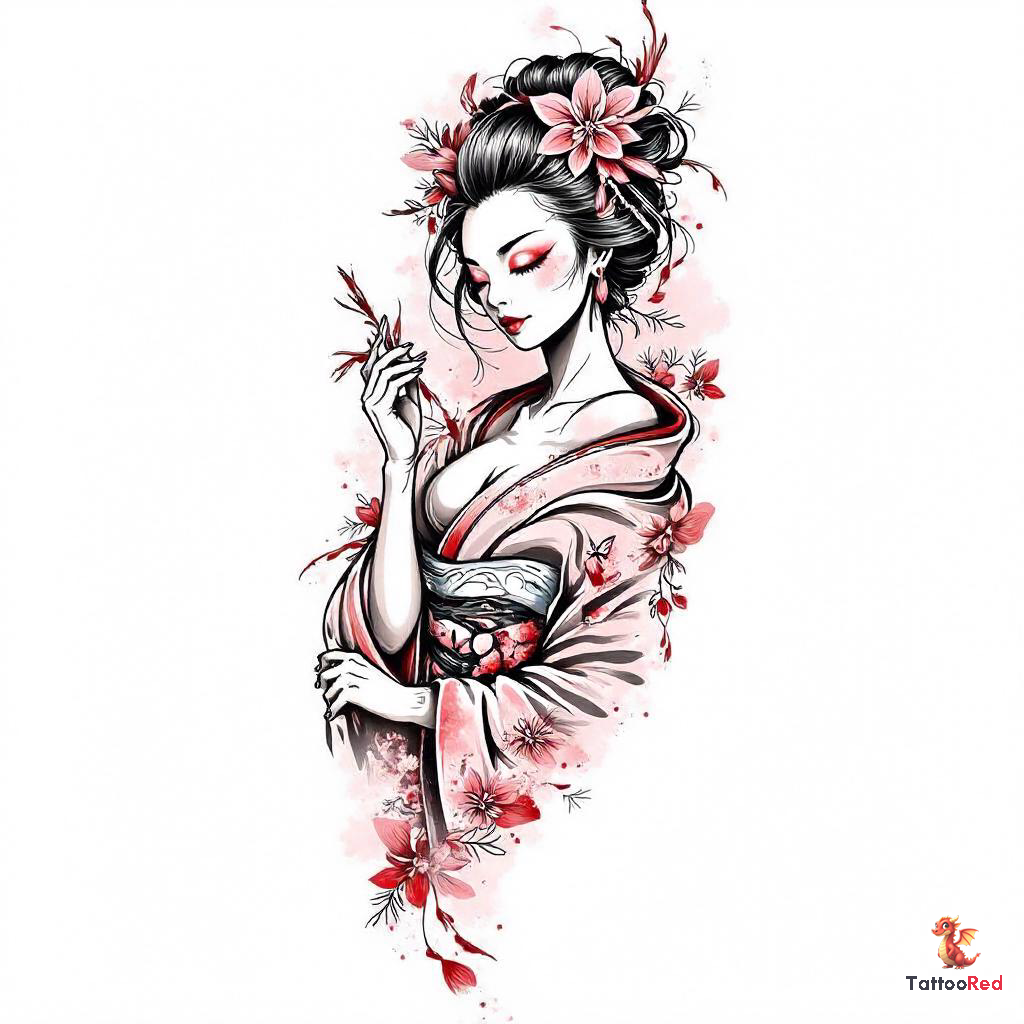 At the center of the design, the geisha stands confidently, her bold pose radiating a sense of empowerment and femininity. The flowing lines of her kimono enhance the fluidity of the design, suggesting movement and life. The open kimono reveals delicate patterns and colors, symbolizing beauty and the intimate connection between the geisha and her art.