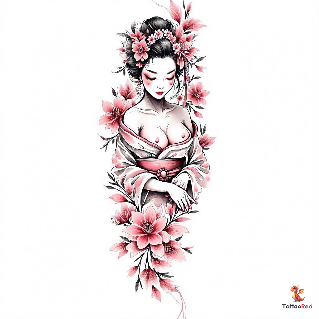 The sensual geisha tattoo is a captivating design that intricately blends cultural symbolism with artistic flair. This tattoo presents a full-body geisha in a bold pose, showcasing her beauty and grace. The geisha's open kimono reveals a delicate balance of sensuality and elegance, embodying the art of femininity in Japanese culture. Her serene expression draws the eye, inviting viewers into a world of tradition and artistry. Surrounding her are vibrant watercolor flowers, which add a playful burst of color to the design. The fluid brushstrokes mimic the movement of water, enhancing the overall aesthetic and creating a sense of depth. Each floral element is meticulously rendered, with petals in shades of pink, symbolizing beauty, love, and the fleeting nature of life. This use of color contrasts beautifully with the monochrome aspects of the geisha, highlighting her features while providing a stunning backdrop.