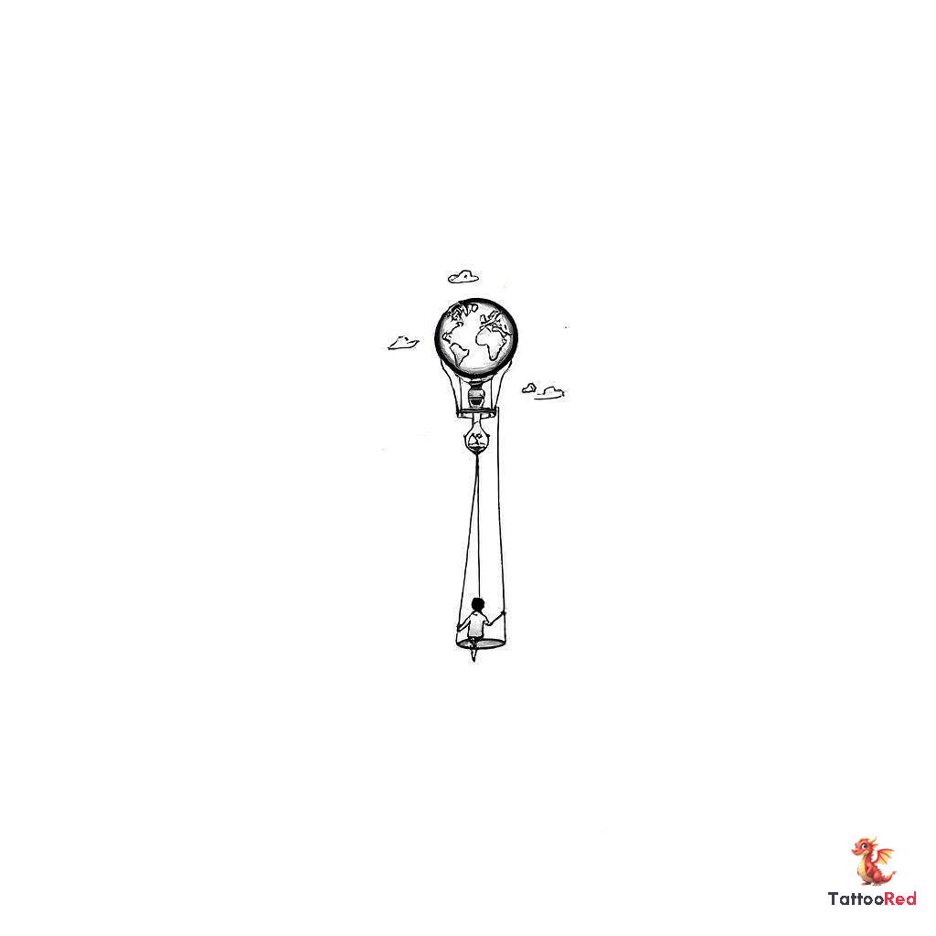 Small long shaped hot air balloon wiht a tapered bottom with a simplified world map inside the ballo