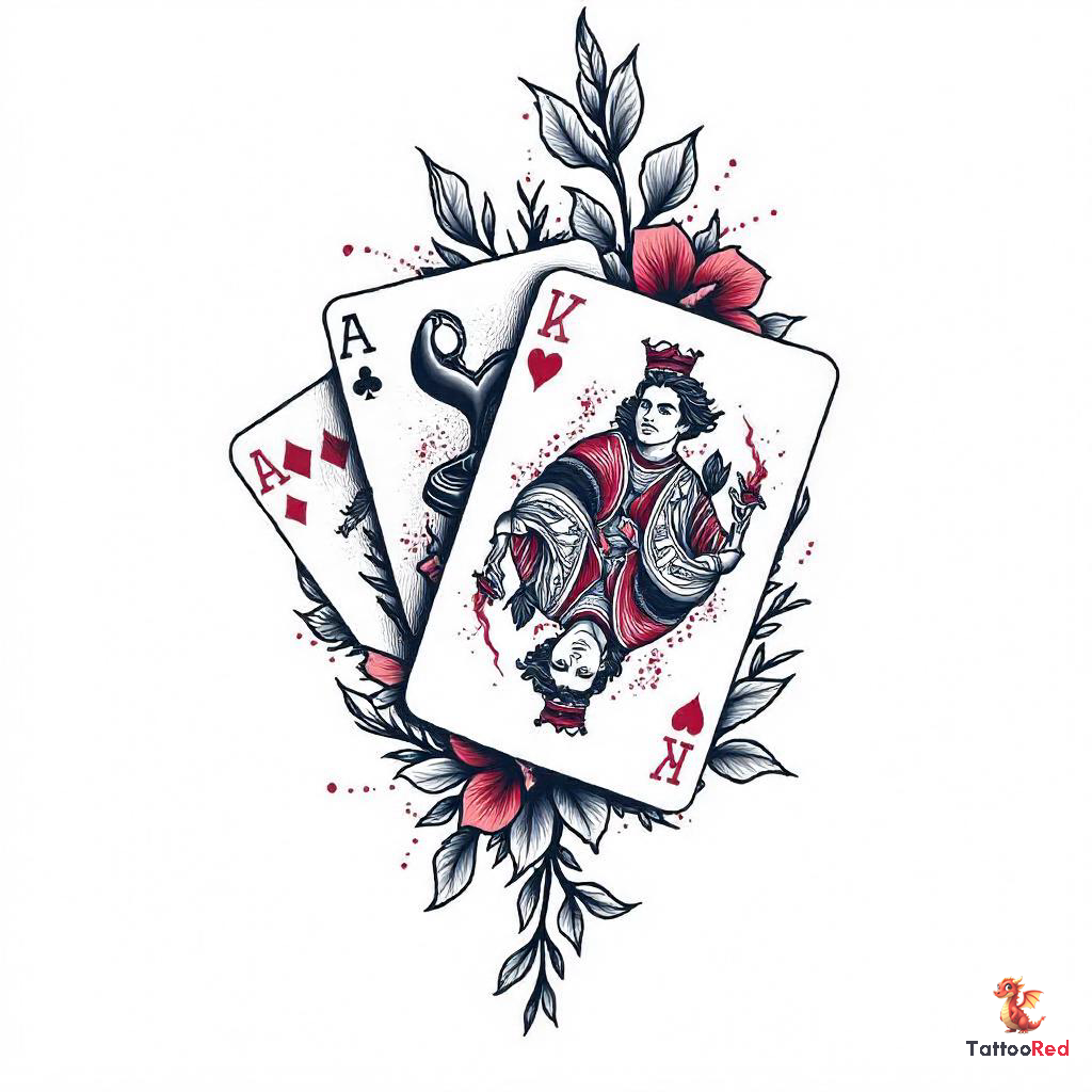 The colors used in this tattoo are both bold and vibrant. Red, representing passion and energy, is prominent, particularly in the King of Hearts. The Ace of Diamonds showcases a striking contrast with black and white elements, adding to the dynamic feel of the design. Such a color palette not only grabs attention but also symbolizes the spirited nature of football fandom.